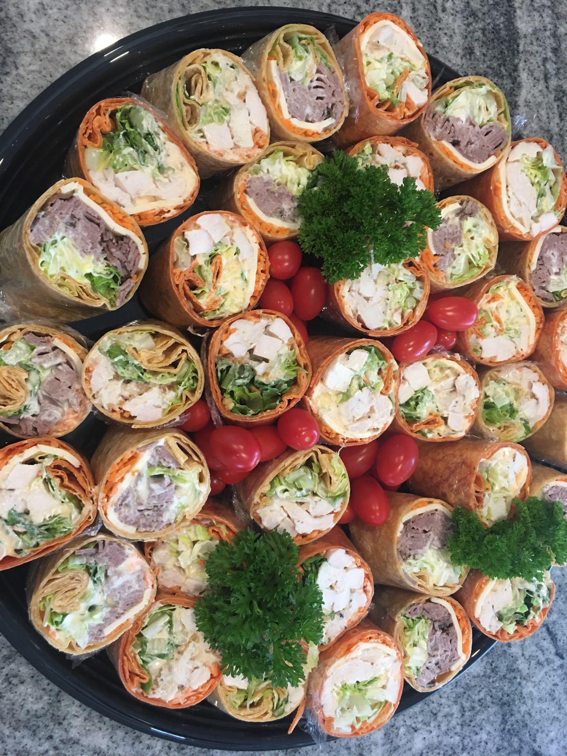 Pour les commandes de moins de 10 personnes, 2 choix de wrap / salade ; pour les commandes de 10 à 20 personnes, 3 choix de wrap / salade ; pour les commandes de plus de 20 personnes, 4 choix de wrap / salade.