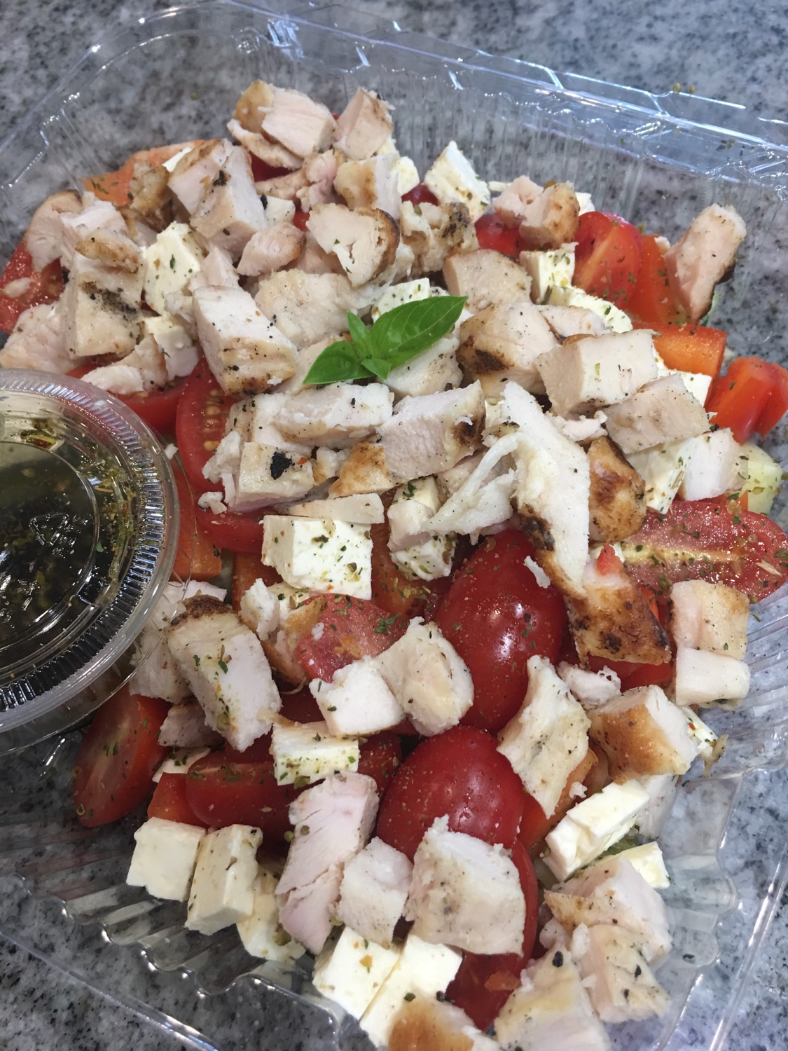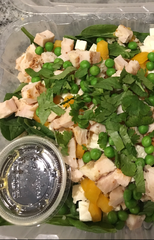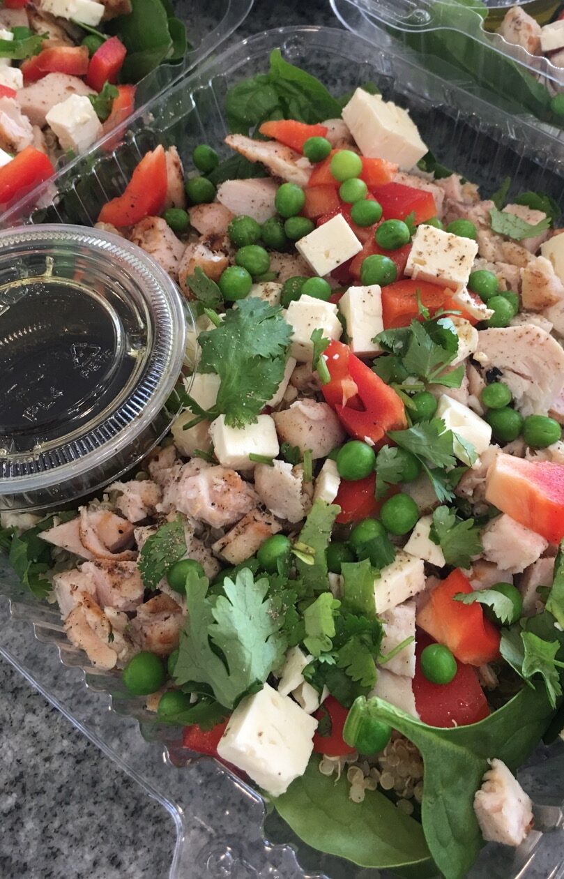 Quinoa, lanières de poulet, épinards, feta , petits pois, poivrons et coriandre fraîche.