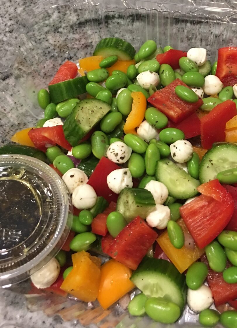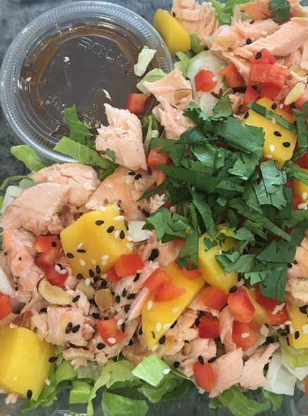 Saumon ou poulet, salade romaine ou épinards, poivrons, mangue et coriandre fraîche. Vinaigrette à l’huile de sésame. Petits craquelins en accompagnement.